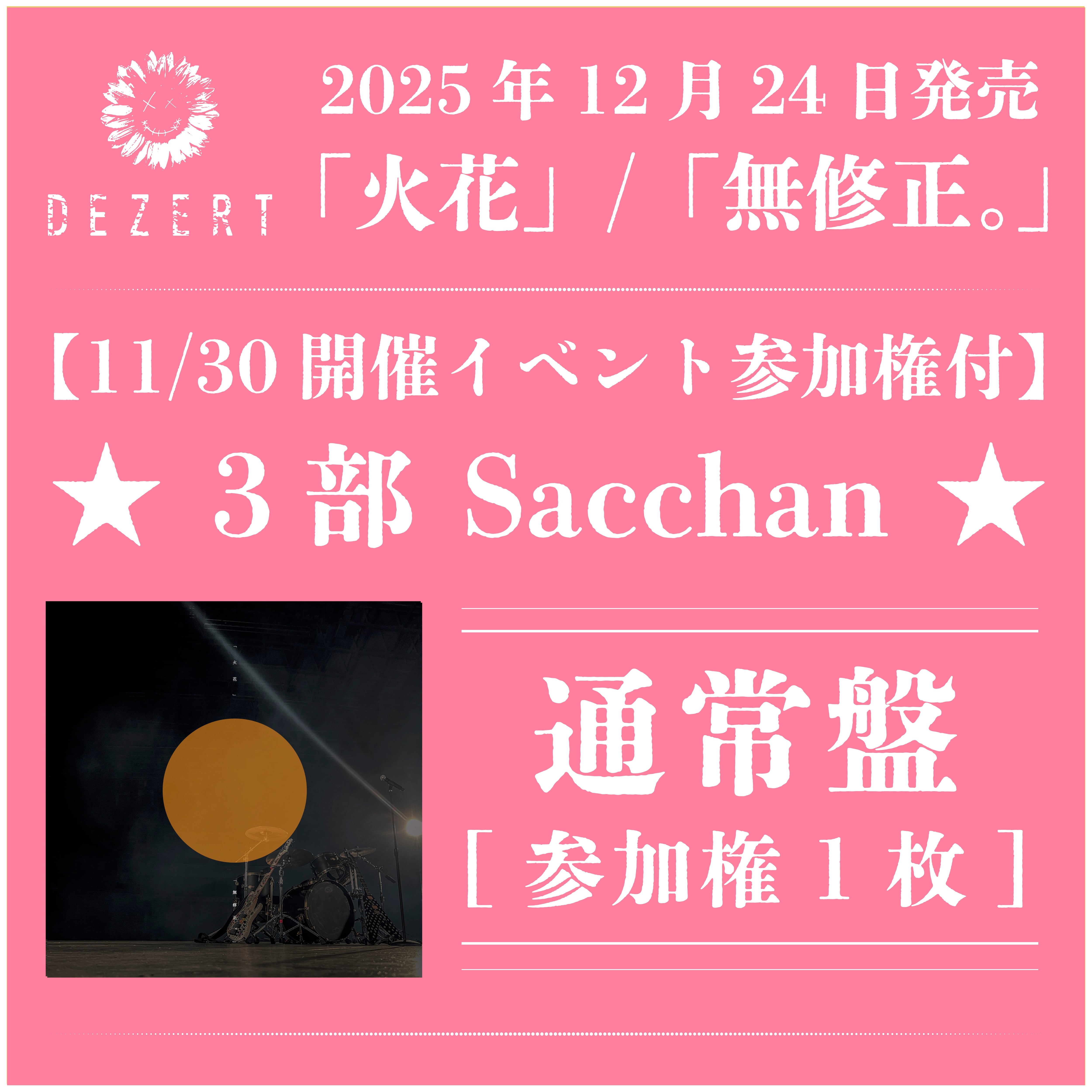 DEZERT 11/30開催 ★3部[Sacchan]イベント参加権[1枚]付★ 2025.12.24 DEZERT / 「火花」/「無修正。」【通常盤】