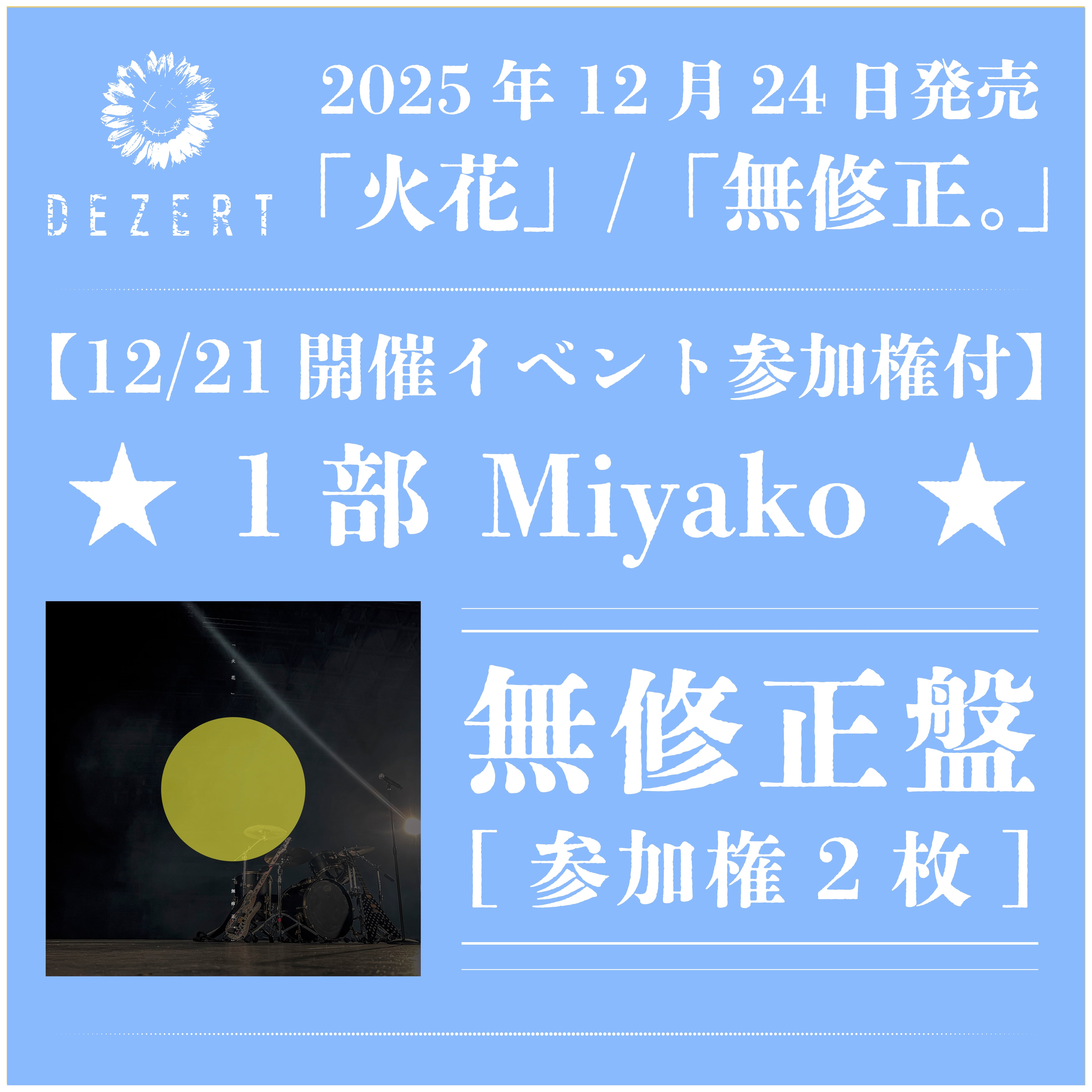 DEZERT 12/21開催 ★1部[Miyako]イベント参加権[2枚]付★ 2025.12.24 DEZERT / 「火花」/「無修正。」【無修正盤】